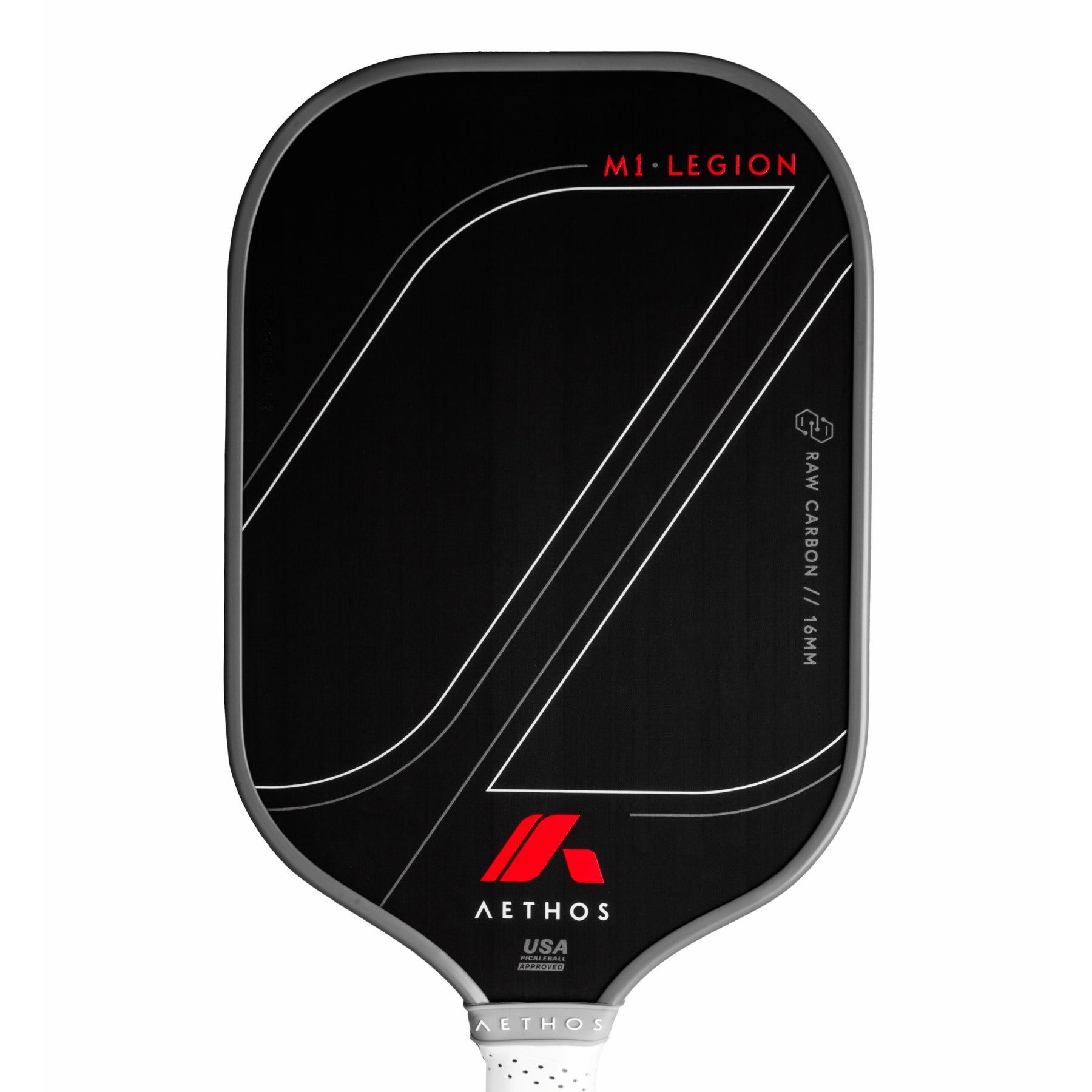 The M1 Legion is a hot-molded (thermoformed) carbon fiber paddle. It features a fully encased carbon fiber reinforced unibody design that extends from the face down to the handle, improving the overall strength and durability of the paddle. The 5.3-inch ergonomically designed handle is tailored for two-handed backhands and features a 4.125-inch grip circumference, suitable for all hand sizes.